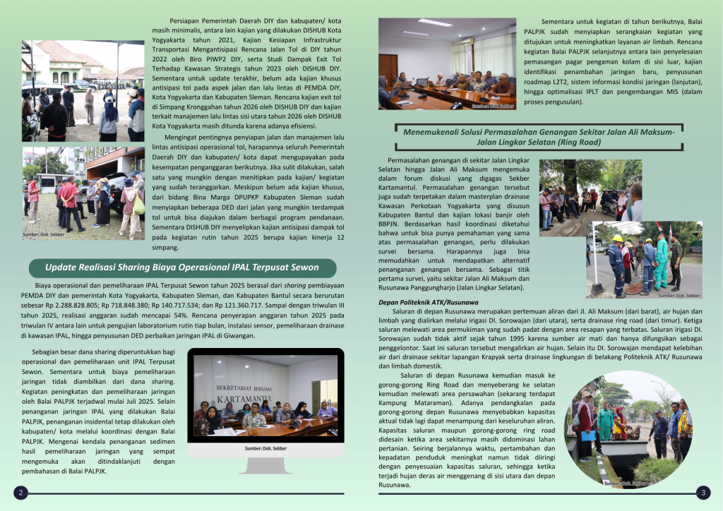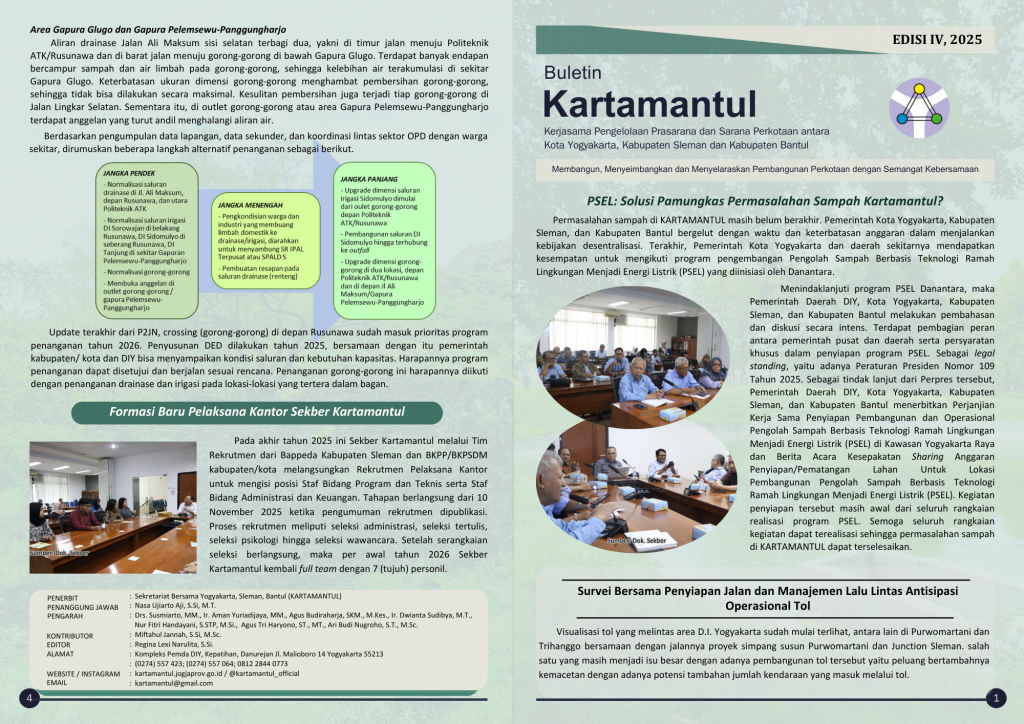 Sekretariat Bersama Kartamantul pada periode IV tahun 2025 telah melangsungkan berbagai kegiatan kerjasama dengan berbagai OPD di tingkat provinsi maupun OPD Kabupaten/Kota wilayah kerja Kartamantul. Kerjasama tersebut meliputi kerjasama pengelolaan sarana prasarana pada enam sektor kerjasama yang meliputi sektor persampahan, air limbah, air bersih, drainase, jalan, dan transportasi. Buletin edisi IV tahun 2025 merangkum beberapa kegiatan pada periode IV meliputi pembahasan terkait pengembangan Pengolah Sampah Berbasis Teknologi Ramah Lingkungan Menjadi Energi Listrik (PSEL), survei penyiapan jalan dan manajemen lalu lintas antisipasi operasional tol, update realisasi sharing biaya operasional IPAL Terpusat Sewon, dan identifikasi solusi permasalahan genangan sekitar Jalan Ali Maksum-Jalan Lingkar Selatan (Ring Road)